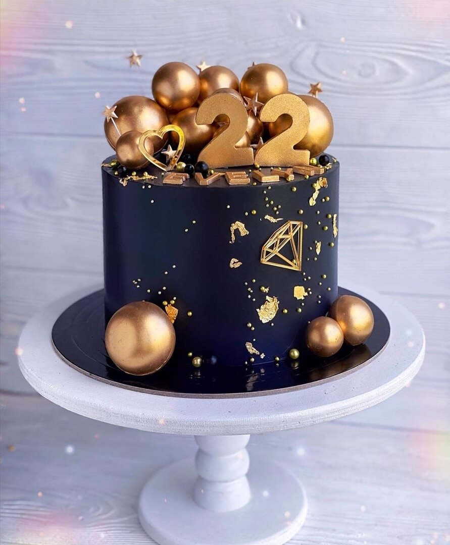 Драгоценный черный тортик, украшенный декором из сладких золотых шаров и маааленьким бриллиантом